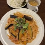 本日のランチ 秋茄子とベーコンのトマトソーススパゲティ サラダ付きはこれ!
