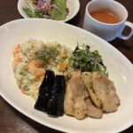 本日のランチは 海老ピラフ バジルチキン添え サラダ付き はこれ!