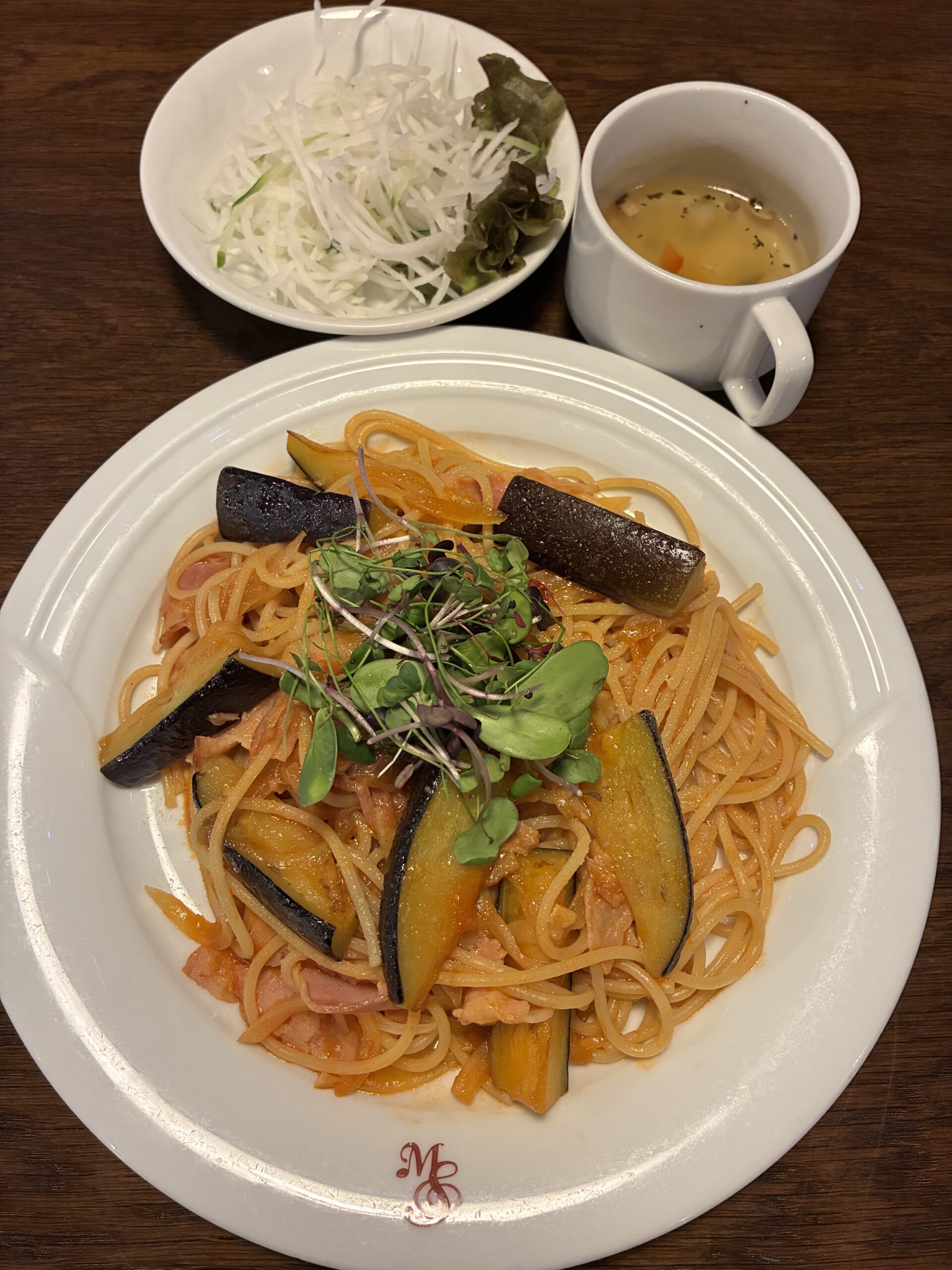 お知らせ お知らせ ランチ ランチ 11月5日(水)本日のランチ 2025年11月05日10時52分 本日のランチ 秋茄子とベーコンのトマトソーススパゲティ サラダ付きはこれ! 40食限定! ランチオプションデザートは チョコレートロールケーキ(¥360) です。 明日のランチは マトウ鯛の香草パン粉焼き です。 お楽しみに😊😊😊 共有:シェアFacebookTwitter