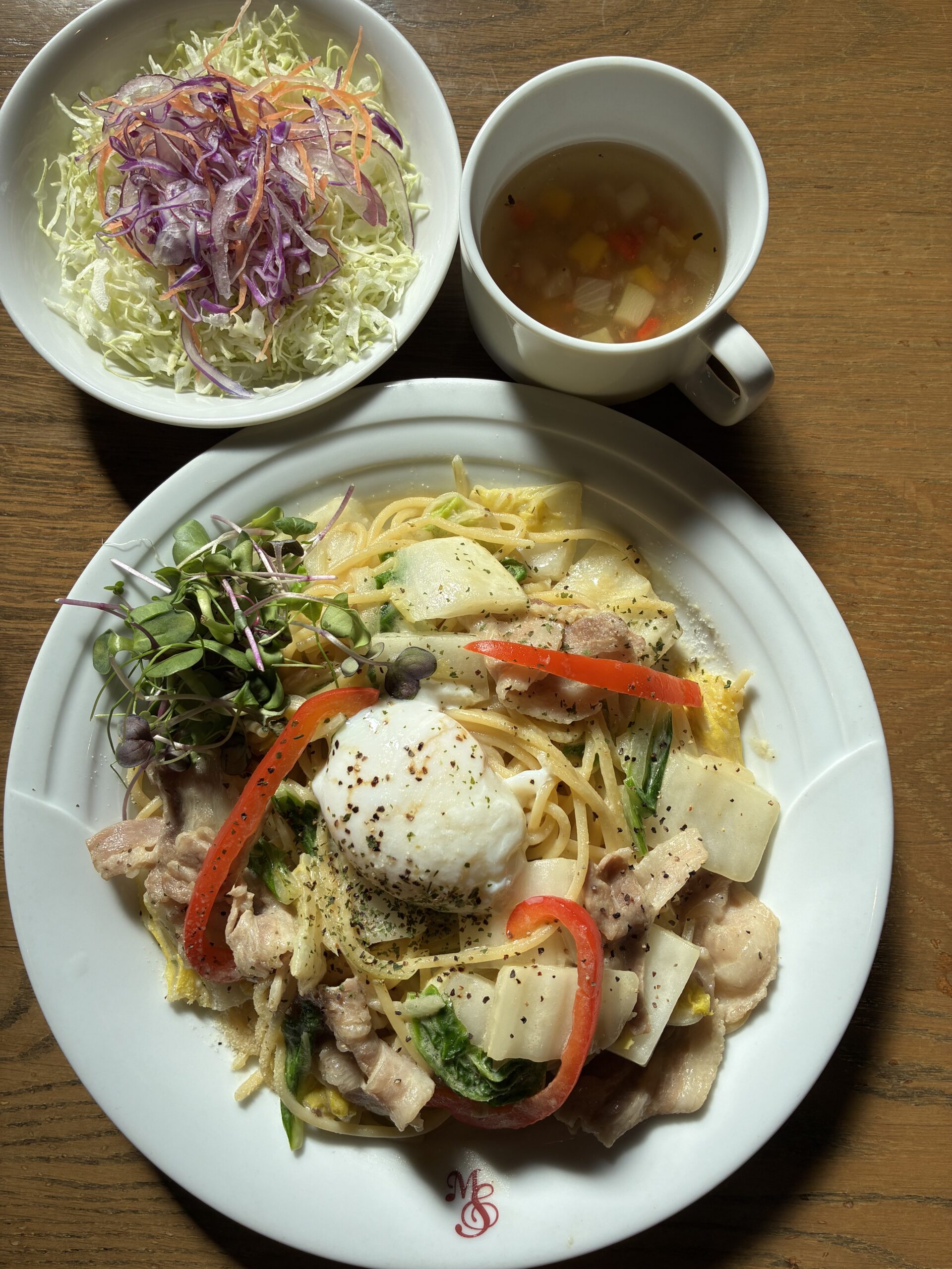 お知らせ お知らせ ランチ ランチ 2月3日(火)本日のランチ 2026年02月03日10時48分 本日のランチ 豚肉と白菜のカルボナーラスパゲティ サラダ付き はこれ! 40食限定! ランチオプションデザート バスクチーズケーキ(¥360)です。 明日のランチは エビフライカレー サラダ付き です! お楽しみに♪