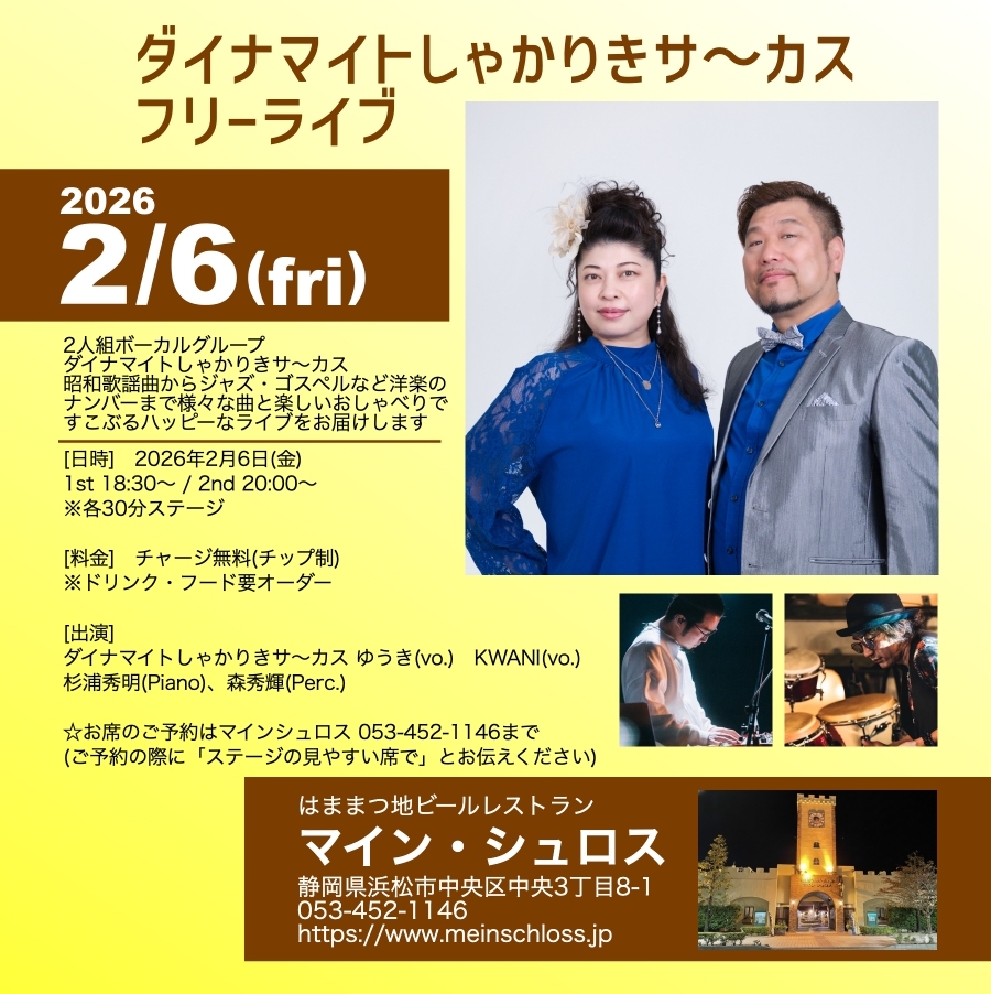 お知らせ お知らせ 最新情報 最新情報 2/6(金) 演奏のご案内♪ 2026年01月23日21時29分 2/6(金)は18:30より「ダイナマイトしゃかりきサ〜カス」の演奏がございます♪ 演奏にご興味がある方は「ステージ近くで」もしくは「ステージの見やすい席で」とお申し付けください!